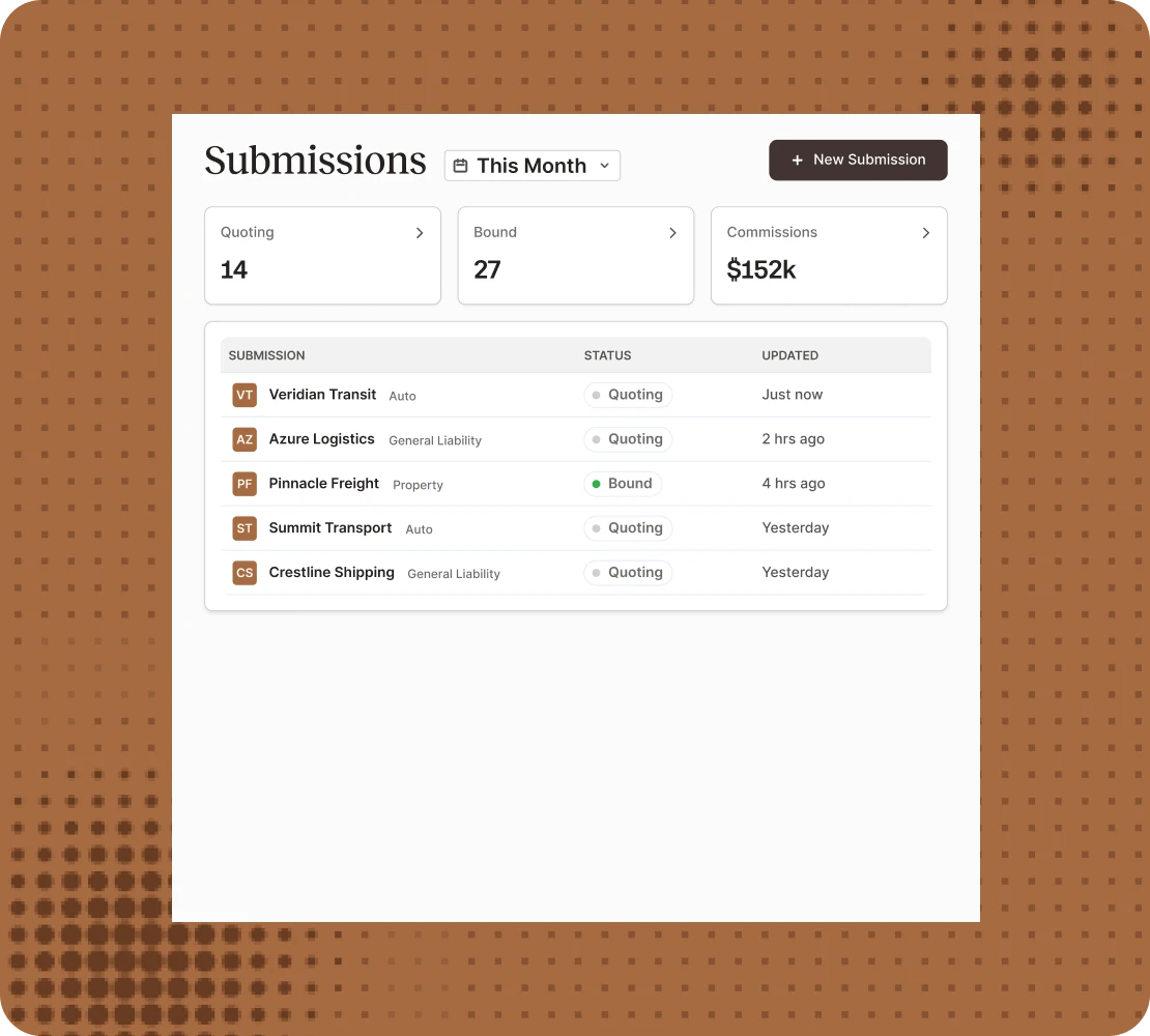 Bring submissions, policies, and billing together so producers have live context, a shared view of every account, and clear next steps.