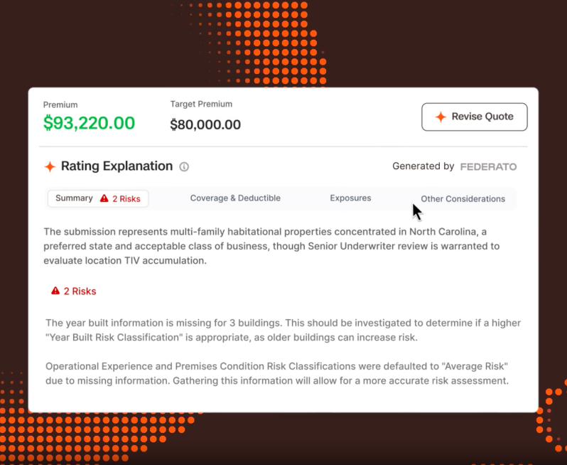 Federato removes manual intake, reduces re-keying, prioritizes high-value opportunities, and generates a quote draft up front for underwriter review, shortening the time between submission receipt and quote delivery.